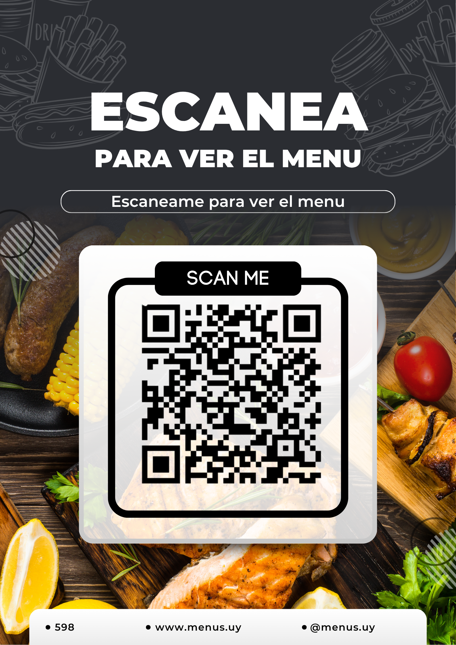 Menús físicos con códigos QR que enlazan a tu menú digital alojado en nuestro sitio web.
